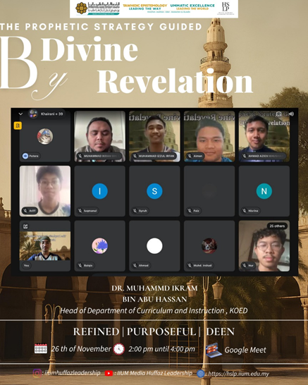 On 26th November 2025, Huffaz Leadership Programme (HLP), IIUM successfully organised an online talk titled “The Prophetic Strategy Guided by Divine Revelation.” The session was delivered by Dr. Muhammad Ikram bin Abu Hassan and aimed to expose students to the core principles of prophetic leadership derived from the Qur’an and divine inspiration. The talk highlighted how Prophet Muhammad ﷺ demonstrated clarity, purpose, and wisdom throughout his leadership journey, offering timeless lessons for modern Muslim youth.